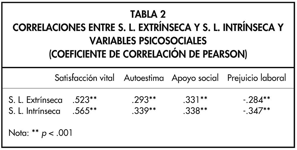 CORRELACIONES ENTRE S. L. EXTRÍNSECA Y S. L. INTRÍNSECA Y VARIABLES PSICOSOCIALES (COEFICIENTE DE CORRELACIÓN DE PEARSON)