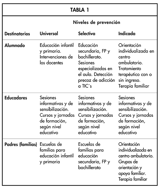 En la experiencia que nos ocupa, la prevención universal se centra en la educación primaria, y se dirige prioritariamente a padres y docentes, pues son ellos los responsables del acompañamiento y de marcar las pautas de uso de nuevas tecnologías en niños y niñas de estas edades (Echeburúa y Requesens, 2012).