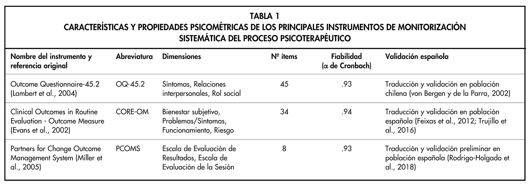 La monitorización sistemática de resultados (Routine Outcome Monitoring [ROM]) en psicoterapia consiste en la evaluación periódica e inmediata mediante instrumentos estandarizados del progreso, o su ausencia, a lo largo del curso del tratamiento psicológico (Lambert, 2010). Esta práctica ha mostrado ser efectiva en la reducción del número de abandonos prematuros y en la mejora de los resultados de los tratamientos, especialmente en los casos en riesgo de estancamiento o que presentan deterioro a lo largo del tratamiento (Lambert y Shimokawa, 2011; Shimokawa et al., 2010). Existen diversos sistemas de feedback para su uso en psicoterapia (véase Tabla 1), siendo su función principal proporcionar al clínico una indicación del estado del paciente para facilitar la flexibilidad y adaptación del tratamiento a las necesidades cambiantes de los pacientes y sus procesos psicoterapéuticos.