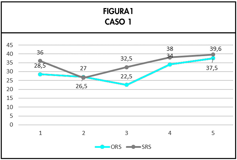 Se trata de un varón de 29 años que acudió a consulta aquejado de bajo estado de ánimo, falta de motivación y baja autoestima. Se encontraba “bloqueado” a la hora de afrontar un trabajo al que no conseguía dedicar todo el tiempo que deseaba y su principal objetivo se centraba en lograr incrementar su motivación para mantenerse “activo”. El tratamiento se desarrolló a lo largo de 5 sesiones, utilizándose PCOMS en todas ellas (véase Figura 1).