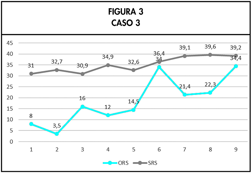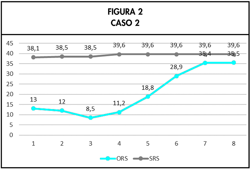 En este caso, al contrario que en el anterior, los datos obtenidos en SRS indicaban que la alianza terapéutica era bastante sólida, aunque a pesar de ello no se dejó de dedicar un tiempo, al final de cada sesión, para tratar de valorar cómo de útil había sido ésta para el paciente. El tipo de feedback que resultó importante fue el proporcionado por las puntuaciones obtenidas en ORS. Hasta la tercera sesión el estatus clínico fue empeorando de manera progresiva, alertando de un posible caso de deterioro. La observación de esta evolución en los datos facilitó que el clínico se planteara un cambio de estrategia terapéutica que sirvió para modificar la tendencia de los resultados como se puede apreciar en la Figura 2.