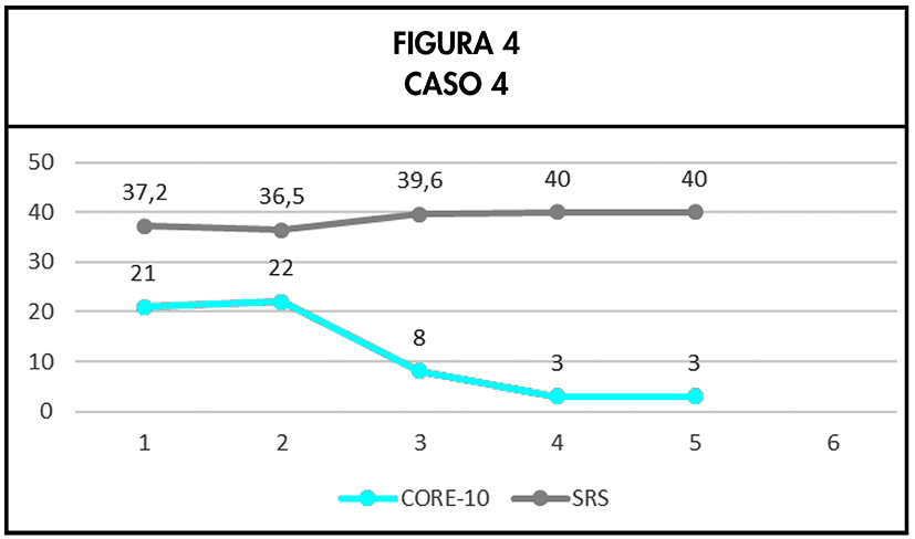 El siguiente caso ejemplifica el uso de otros instrumentos de medida que también nos permiten obtener feedback y se pueden integrar en PCOMS en función de las necesidades clínicas del caso. Para evaluar la alianza terapéutica se utilizó de nuevo la escala SRS. Los resultados del tratamiento se monitorizaron con la versión reducida de 10 ítems del CORE-OM (Feixas et al., 2012). El paciente era un hombre de 39 años que presentaba diversos síntomas de ansiedad (insomnio, tensión muscular, angustia, rumiaciones) que afectaban a su vida personal y familiar. Los problemas habían comenzado a raíz de un cambio importante en su empresa y supusieron un incremento considerable de su carga laboral. Se llevó a cabo una psicoterapia breve centrada en el desarrollo de estrategias de afrontamiento del estrés que duró 5 sesiones. Los resultados obtenidos se pueden consultar en la Figura 4.