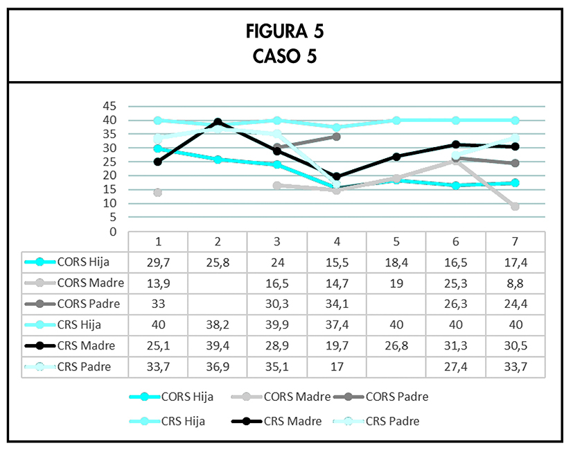 Esta terapia finalizó con el abandono del tratamiento. Como se puede observar en la Figura 5, tanto las medidas de resultado como de relación no fueron buenas. El clínico que los atendió asume su responsabilidad en el desenlace ya que, a pesar de haber dedicado tiempo al feedback recibido todas las sesiones, reconoce que no tuvo en cuenta realmente sus opiniones. Por ejemplo, sin ser exhaustivos, en la última consulta a la que asistieron, el padre informó que pensaba que el tratamiento debería haberse centrado más en la niña y no tanto en la familia. Sin embargo, el tiempo dedicado a los padres o a toda la familia fue mucho mayor que el dedicado a la niña.