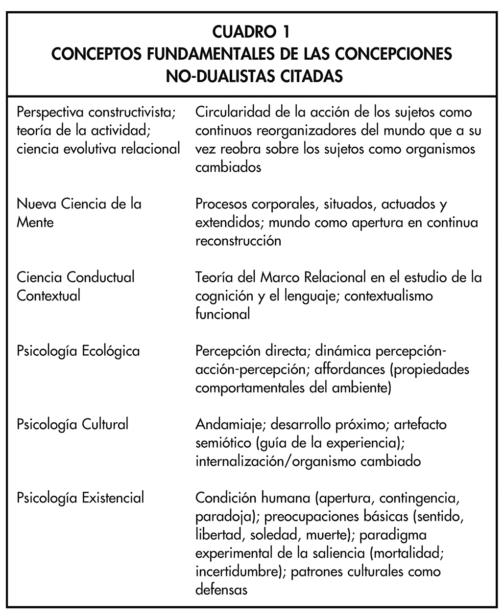 El Cuadro 2 trata de mostrar siquiera esquemáticamente la diferente ontología dualista-monista reductora de la psicología como ciencia de la mente y la conducta y en su caso la neurociencia cognitiva, en relación con la ontología plural tripartita de una concepción de la psicología centrada en el sujeto (no la mente o el cerebro), el comportamiento (no la conducta como ejecución externa) y el mundo organizado con todas sus andamiajes y affordances (no información a procesar).