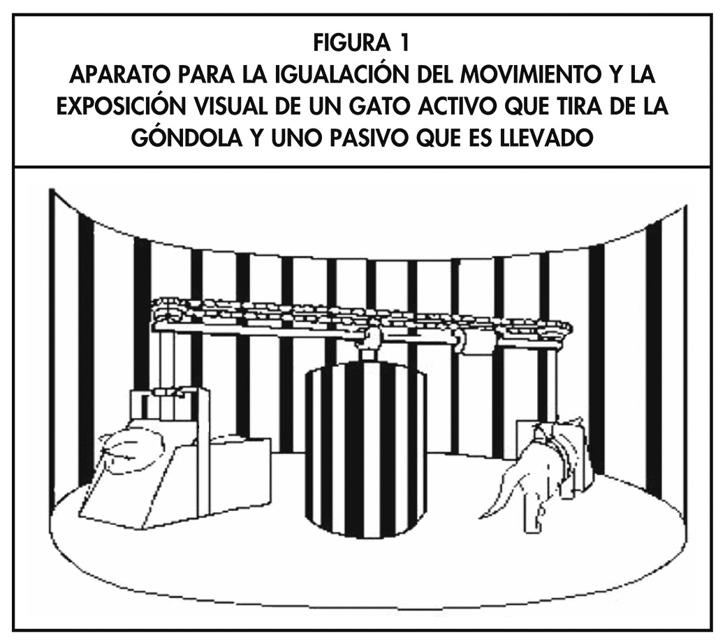 La noción de affordance guarda relación con las nociones de nicho de la teoría evo-devo, de marco-conductual (behavioral setting) de la ciencia eco-conductual de Roger Baker y de andamiaje (scaffolding) de Vygotski. El andamiaje cultural y la disponibilidad del ambiente (scaffolding, affordance) son conceptos complementarios de un enfoque no-representacional (Estany y Martínez, 2014; Ramstead et al, 2016). La noción de affordance (junto con andamiaje) nos ofrece otra manera de entrar en la psicología. Frente a la usual entrada empezando por la percepción como un primer proceso de una serie de ellos (cajas, módulos), la percepción gibsoniana consiste en acciones y operaciones del organismo correlativas a los “objetos” del ambiente. Recuérdese el célebre experimento de Held y Heine, cómo el gato activo desarrolla el patrón de profundidad, a diferencia del pasivo que es llevado en la góndola, pese a que la estimulación es la misma para ambos (Held & Heine, 1963). Véase Figura 1. Si fuera cosa de procesamiento, el gato llevado como un “señorito” en la góndola podría hacerlo tanto mejor que el “trabajador”. Como concluye Pinillos de este experimento, la acción constituye un ingrediente esencial de la actividad perceptiva completa (Pinillos, 1975, p. 198).