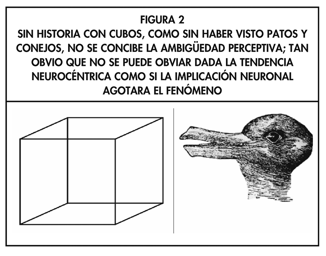 El cubo de Necker se presta a mostrar cómo un fenómeno psicológico—perceptivo-experiencial-subjetivo—, en este caso una percepción ambigua, implica aspectos físicos (segmentos de rectas dibujadas en un papel, así como procesos neurofisiológicos de la percepción) y aspectos abstractos (leyes geométricas de los poliedros), sin reducirse a ellos, puesto que sin la mediación de un sujeto institucional (con una historia perceptiva) no hay fenómeno. El fenómeno no es meramente neuronal por más que implica (cómo no) una compleja red de procesos neurofisiológicos. A partir del fenómeno dado (perceptivo experiencial) se puede ver qué pasa en el cerebro, pero de ver lo que pasa en el cerebro no se deduce el fenómeno. El fenómeno no se produce directamente desde los segmentos en un plano a las neuronas. El fenómeno no se da en las neuronas, más que en los libros de neurociencia barata. El fenómeno implica un sujeto con neuronas (faltaría más), pero también con una historia perceptiva. Sin experiencia con cubos (algo prácticamente universal en nuestra sociedad) difícilmente es concebible el fenómeno, como sin haber visto patos y conejos tampoco se daría la famosa percepción ambigua pato-conejo que popularizara Wittgenstein. Véase Figura 2.