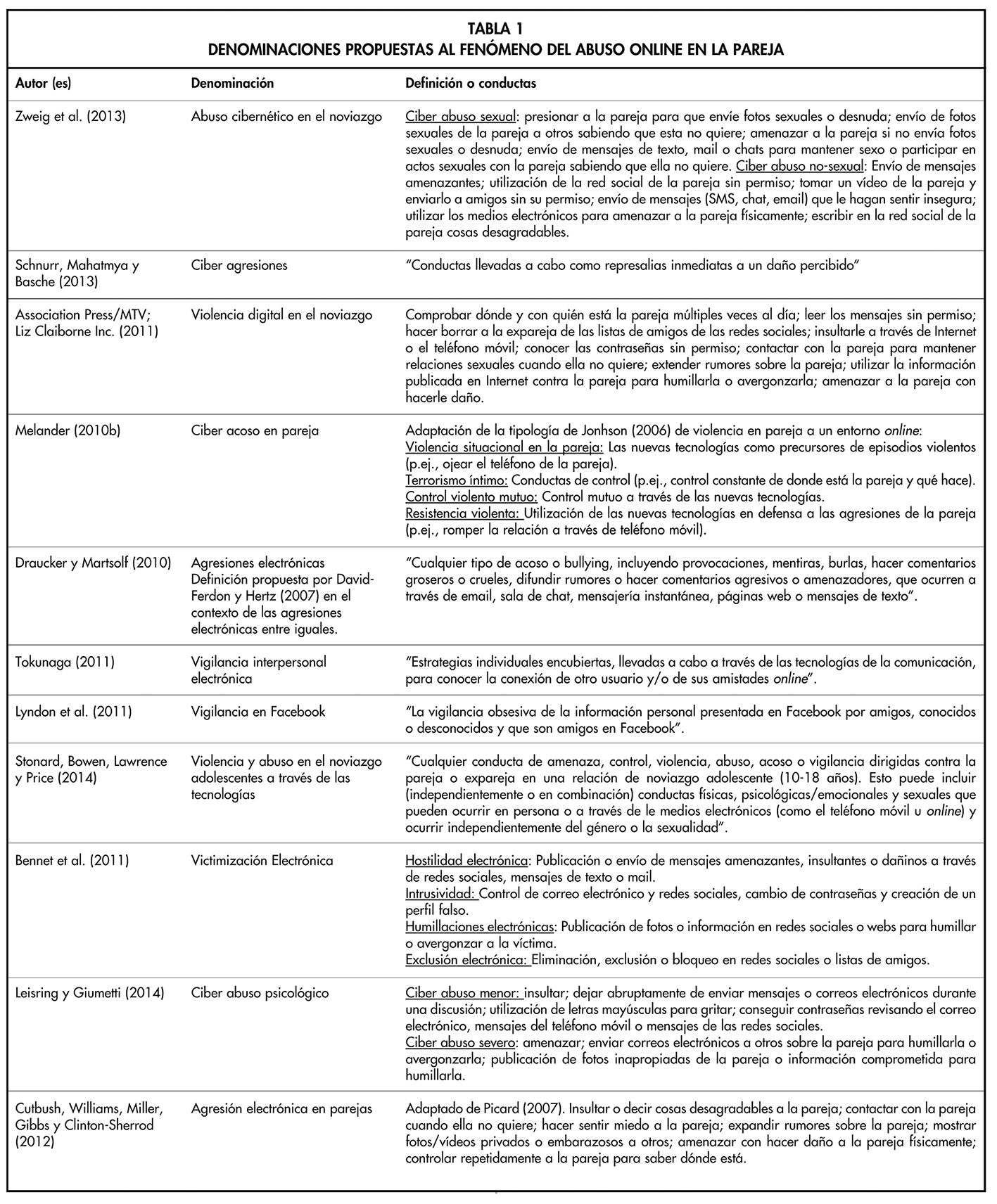 Si bien el estudio del abuso online en la pareja ha comenzado a generar mayor interés en los últimos años, aún son relativamente pocas las investigaciones realizadas sobre esta problemática (Brown y Hegarty, 2018; Hinduja y Patchin, 2011). Esta escasez de atención empírica ha derivado en la ausencia de una definición consensuada para delimitar el fenómeno, lo que ha generado una amplia variedad terminológica en lo referente a su conceptualización. En la Tabla 1 se incluyen las diferentes denominaciones propuestas por diversos autores, así como las definiciones o, en su caso, las conductas específicas que permiten caracterizar el fenómeno. Como puede observarse, algunos de los términos para referirse a este problema incluyen “abuso cibernético” en la pareja, “ciber agresiones”, “violencia digital” en el noviazgo, “ciberacoso” en pareja, “agresiones electrónicas” o “victimización electrónica”, entre otros. A nuestro modo de ver, los términos abuso online en la pareja son los más inclusivos al dar cabida a un amplio rango de conductas, como el control psicológico (p.ej., dónde está la pareja en todo momento y con quién), el acoso (p.ej., llamadas repetidas e insidiosas) y las agresiones psicológicas y verbales, tales como insultos, amenazas y humillaciones (Borrajo y Gámez-Guadix, 2016; Zweig, Lachman, Yahner y Dank, 2014).