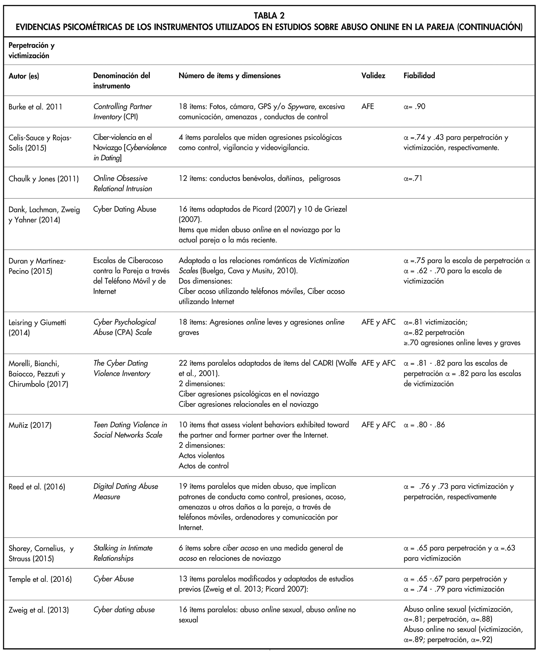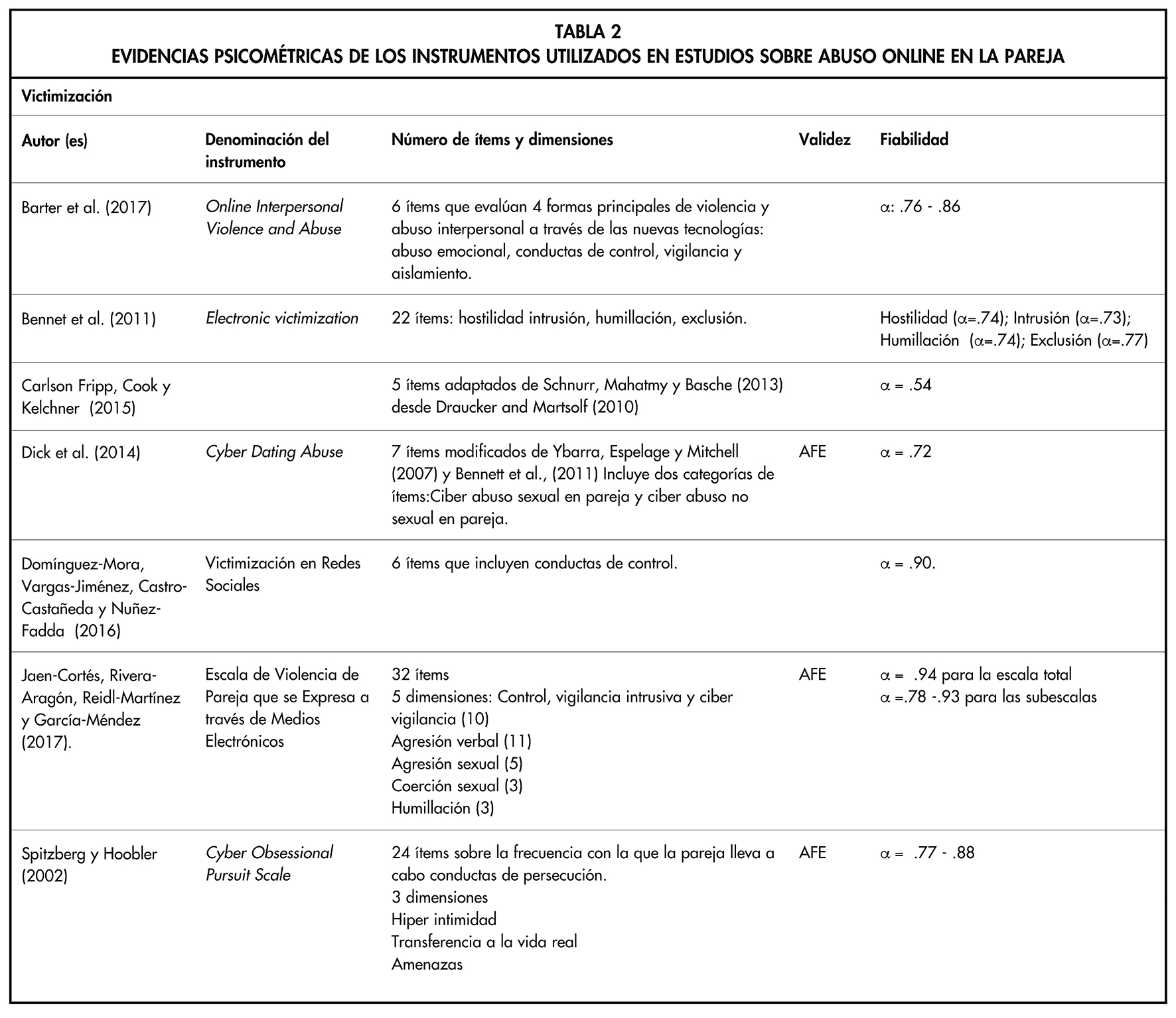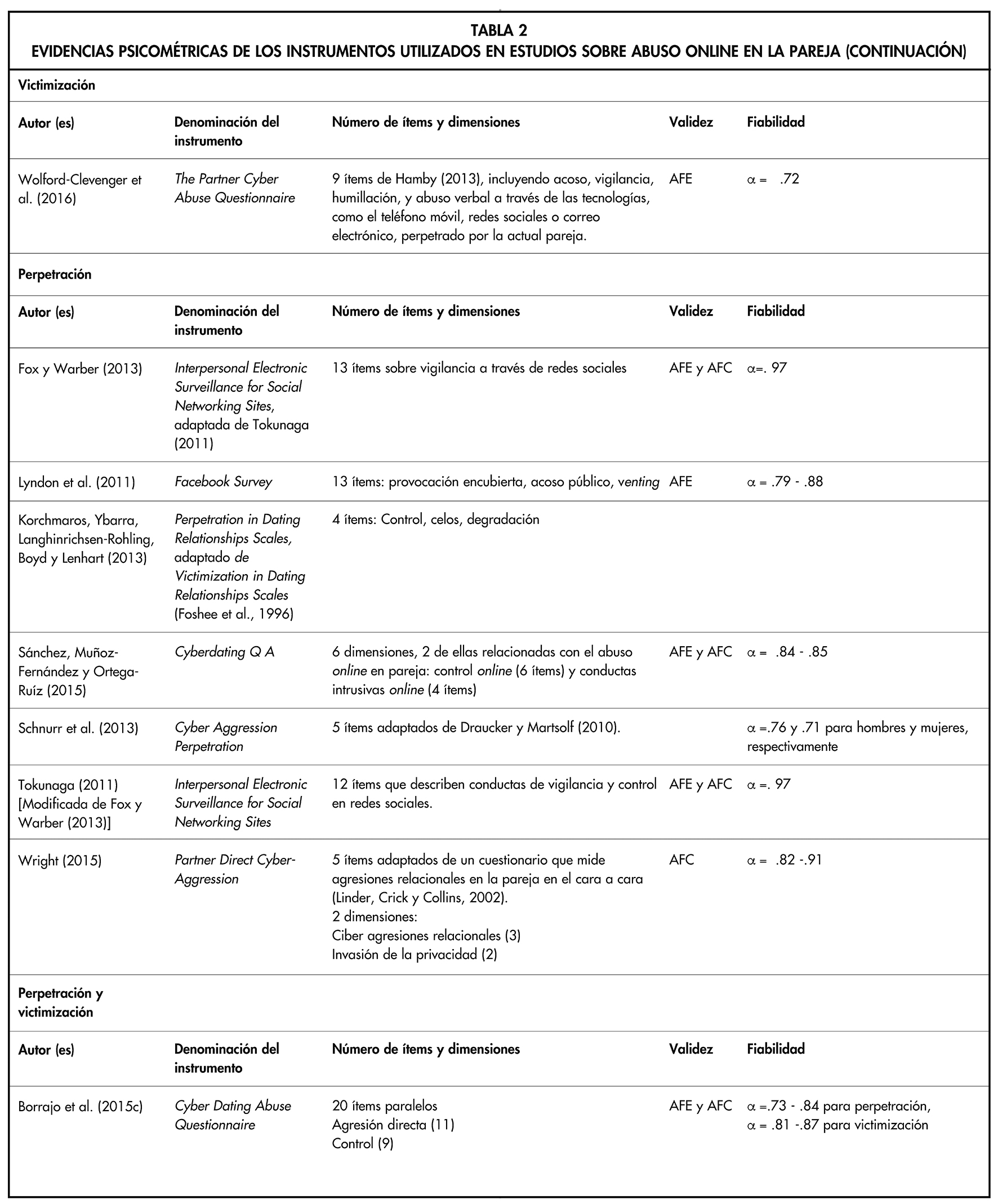 La investigación sobre los instrumentos para evaluar el abuso online en la pareja ha avanzado considerablemente. El listado de los instrumentos elaborados para este fin hasta la fecha se presenta en la Tabla 2. Se han agrupado en función de si evalúan victimización (Bennett et al., 2011), perpetración (Lyndon, Bonds-Raacke y Cratty, 2011), o ambos (Borrajo, et al., 2015c). Como puede observarse, la mayoría de las escalas se centran en tipos específicos del abuso online en relaciones de noviazgo, como, por ejemplo, las conductas de control excesivo a través de Facebook (Tokunaga, 2011). Es importante señalar que algunos estudios no proporcionan evidencias sobre la validez de las escalas, o la evidencia sobre su validez es limitada. La mayoría de ellos sí informan sobre una adecuada fiabilidad, principalmente sobre la consistencia interna de las escalas.