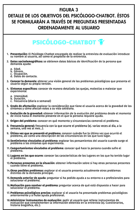 DETALLE DE LOS OBJETIVOS DEL PSICÓLOGO-CHATBOT. ÉSTOS SE FORMULARÁN A TRAVÉS DE PREGUNTAS PRESENTADAS ORDENADAMENTE AL USUARIO