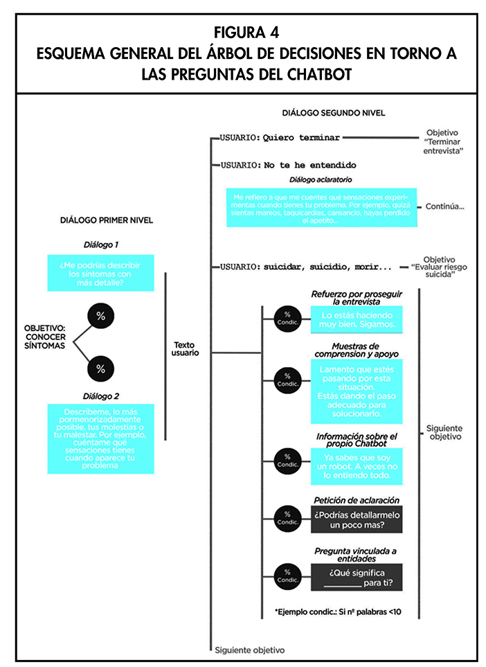 Las figuras 2 y 3 reflejan la estructura y los objetivos que debería tener un chatbot cuya finalidad es realizar una pre-evaluación a un usuario que demanda ayuda psicológica.