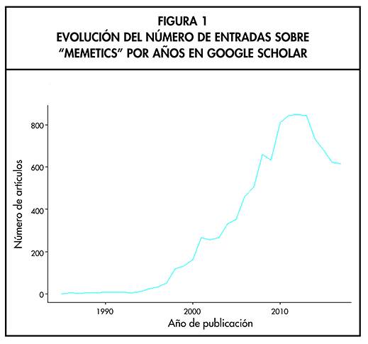 Aunque el interés en la memética haya disminuído (véase la Figura 1), no se puede decir que se haya extinguido. Un análisis de las publicaciones de los últimos años muestra que la memética sigue viva, pero en nuevos formatos: se utiliza en el análisis de fenómenos “virales” en redes sociales, mass media, modas, música, series, películas o videojuegos (e.g.: Bao, 2017; Jan, 2017; Stephens, 2018). También ha tenido repercusión en la lingüística y sirve de marco para el análisis de la propagación de expresiones o de la evolución de los préstamos entre idiomas (e.g.: Xia, 2017; Yang, 2017). La informática, por su parte, también ha generado algoritmos meméticos inspirada en esta teoría (e.g.: Hart, Krasnogor y Smith, 2004).