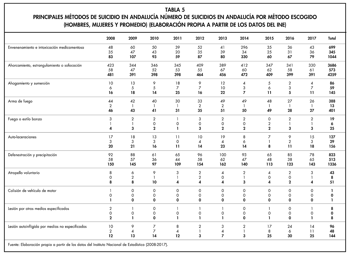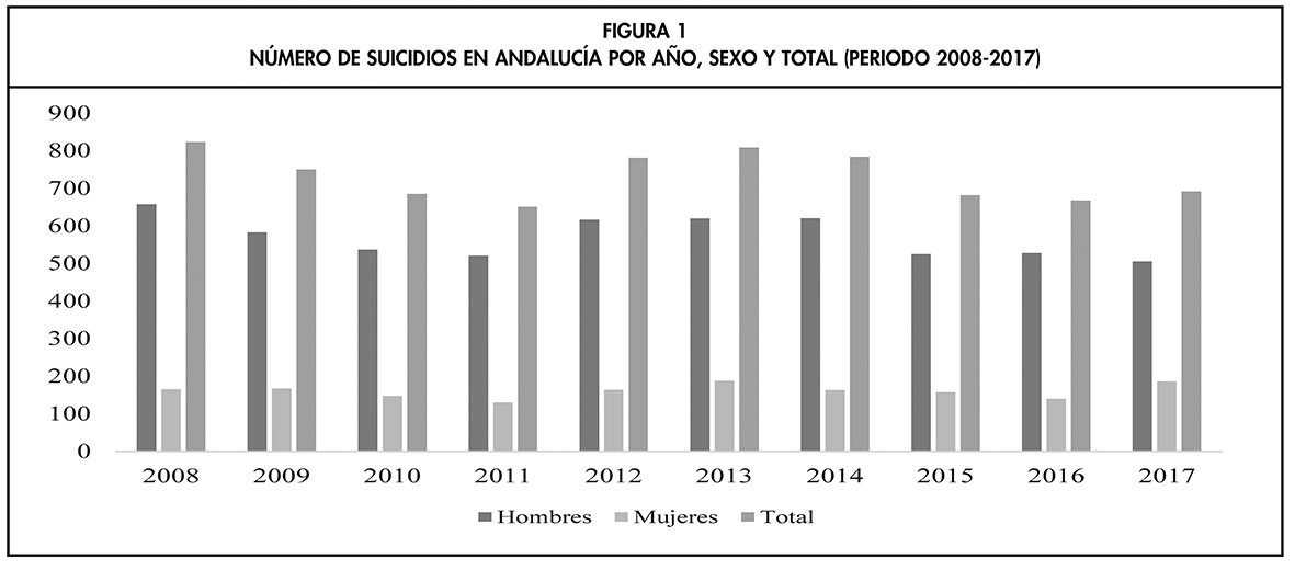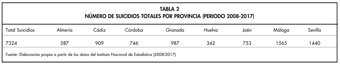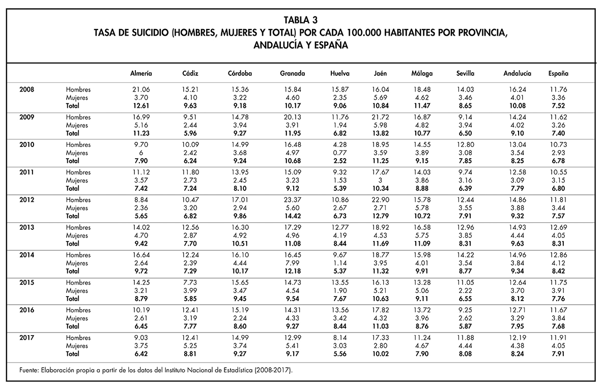 Los datos disponibles en el INE (2017) muestran que durante el período estudiado (2008-2017), en Andalucía se suicidaron un total de 7324 personas, (5716 hombres y 1608 mujeres). El año en el que se registró un mayor número de suicidios fue 2008 con 823 suicidios. Por el contrario, en 2011 se registró la cifra más baja, 651 suicidios. Desglosado por provincias Málaga fue la provincia con mayor número de suicidio en este período, seguida de Sevilla; Huelva y Almería fueron las provincias con menos suicidios. Sin embargo, dada la desigual distribución de la población, a la hora de establecer comparaciones entre provincias es más conveniente recurrir a las cifras que arroja la Tasa de Suicidios por cada 100.000 habitantes. Con respecto a esta, es reseñable que en todos los años consultados la Tasa de Suicidio total en Andalucía superó la media nacional. Desglosado por sexos, se encuentra esta misma tendencia: tanto la Tasa Media de suicidios en hombres como en mujeres superó la media nacional para cada sexo, con la excepción de 2011, 2015 y 2016 en mujeres, donde la cifra estuvo por debajo de la media nacional. La Tasa Media total más elevada en Andalucía se registró en el año 2008, y por el contrario la cifra más baja se dio en 2011; en el caso de los hombres, la Tasa más elevada se registró en 2008, la más baja en 2015 y en las mujeres la Tasa más elevada corresponde a 2013 y la más baja a 2011. La tendencia es descendente hasta el año 2012 en el que sufre un repunte; en el período 2014-2016 se produce un descenso, que en 2017 se invierte de nuevo.