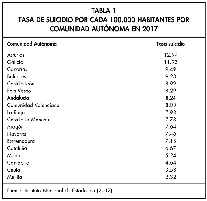 Fuente: Elaboración propia a partir de los datos del Instituto Nacional de Estadística (2008-2017).Andalucía es la comunidad autónoma donde se produce un mayor número total de suicidios, sin embargo, ocupa la séptima posición en cuanto a la Tasa de suicidio por cada 100.000 habitantes (resultado del cociente del número total de suicidios por comunidad entre la población total de esa comunidad y multiplicado este resultado por 100.000) por detrás de Asturias, Galicia, Canarias, Baleares, Castilla-León y País Vasco. Los últimos datos disponibles en el INE correspondientes a 2017, señalan que la Tasa de Suicidio en Andalucía es de 8.26 suicidios por cada 100.000 habitantes, lo que la sitúa por encima de la media de España para ese año (7.91). En este último año registrado, Málaga sería la provincia que más se acercaría a la media nacional (7.90).