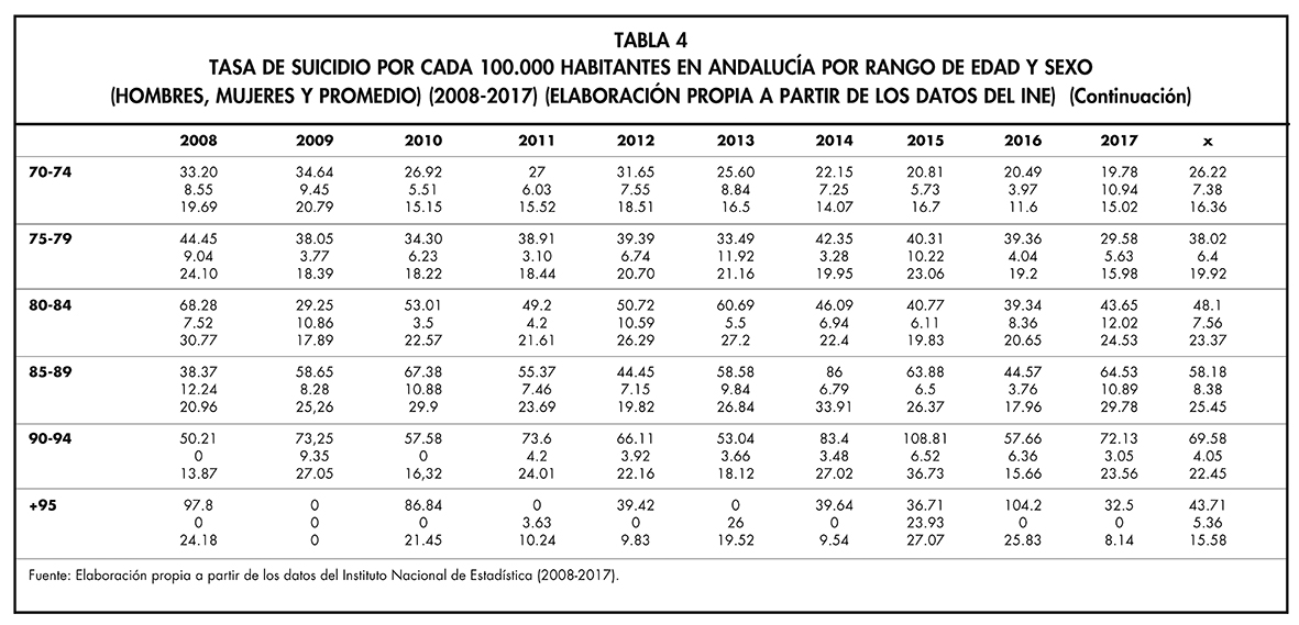 En cuanto a la distribución del suicidio por edades resulta muy alarmante las elevadas Tasas de Suicidio encontradas entre los mayores. De hecho, la Tasa Media de Suicidio por cada 100000 habitantes más elevada se da en la franja de edad entre los 85 y los 89 años, franja más elevada a su vez para las mujeres seguida de los 80-84 y los 90-94, tramo en el que la Tasa Media para los hombres es la más elevada, siendo una tasa bastante alarmante. Por otro lado, si bien, en algunos trabajos previos (Gutiérrez, 1998), se ha descrito un incremento relativo del suicidio entre jóvenes, este fenómeno no se da en Andalucía ni en jóvenes, ni en edades medias, con excepciones puntuales en algunos años, que se observan en las tablas, aunque sin ser significativo. De hecho, en los más jóvenes se encuentran las tasas más bajas (en los tramos 15-29 y 30-39).
