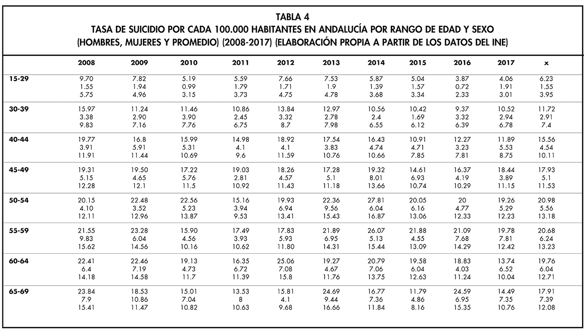 En la Tabla 3 se presenta la Tasa de suicidios desglosada por provincia y sexos, así como la media de Andalucía y de España (2008-2017).