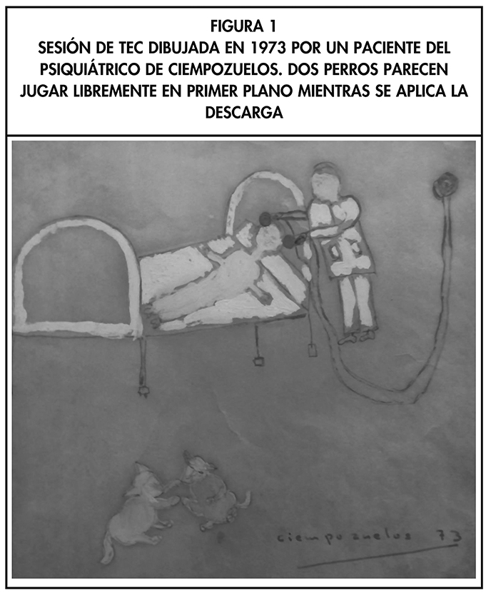 En Nueva York, Almansi e Impastato utilizan por primera vez electroshock en 1940, no sin antes comprobar, una vez más, su seguridad con perros. Es interesante observar cómo algunos pacientes muestran esta vinculación histórica entre la TEC y los perros en sus dibujos (ver Figura 1). Ya en marzo, Gonda había administrado el tratamiento en la ciudad de Chicago a 40 pacientes en una atmósfera de entusiasmo que pronto se generalizaría. La innovación llega a España también en 1940.