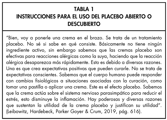 La información que desgrana el efecto placebo en términos comprensibles para el paciente y que de este modo contribuya a hacer más digerible el “engaño” no necesariamente mejora los efectos de éste. Un ejemplo de instrucciones alternativas puede verse en la Tabla 1.