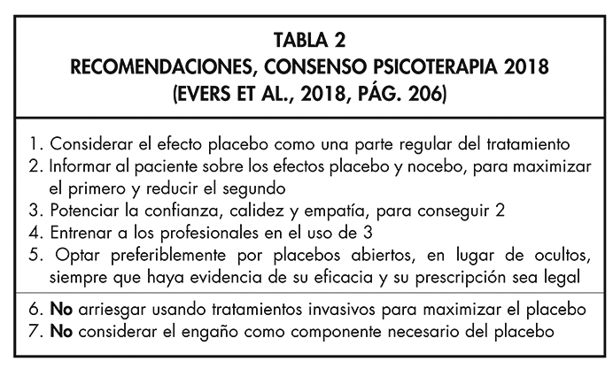 Para finalizar este artículo quiero traer el consenso sobre el uso del efecto placebo y nocebo publicado por Psychotherapy and Psychosomatics (Evers, et al., 2018) y que consta de cinco recomendaciones y dos advertencias (ver Tabla 2); en ellas se resumen e integran los conocimientos sobre el tema que han sido considerados en estas líneas.