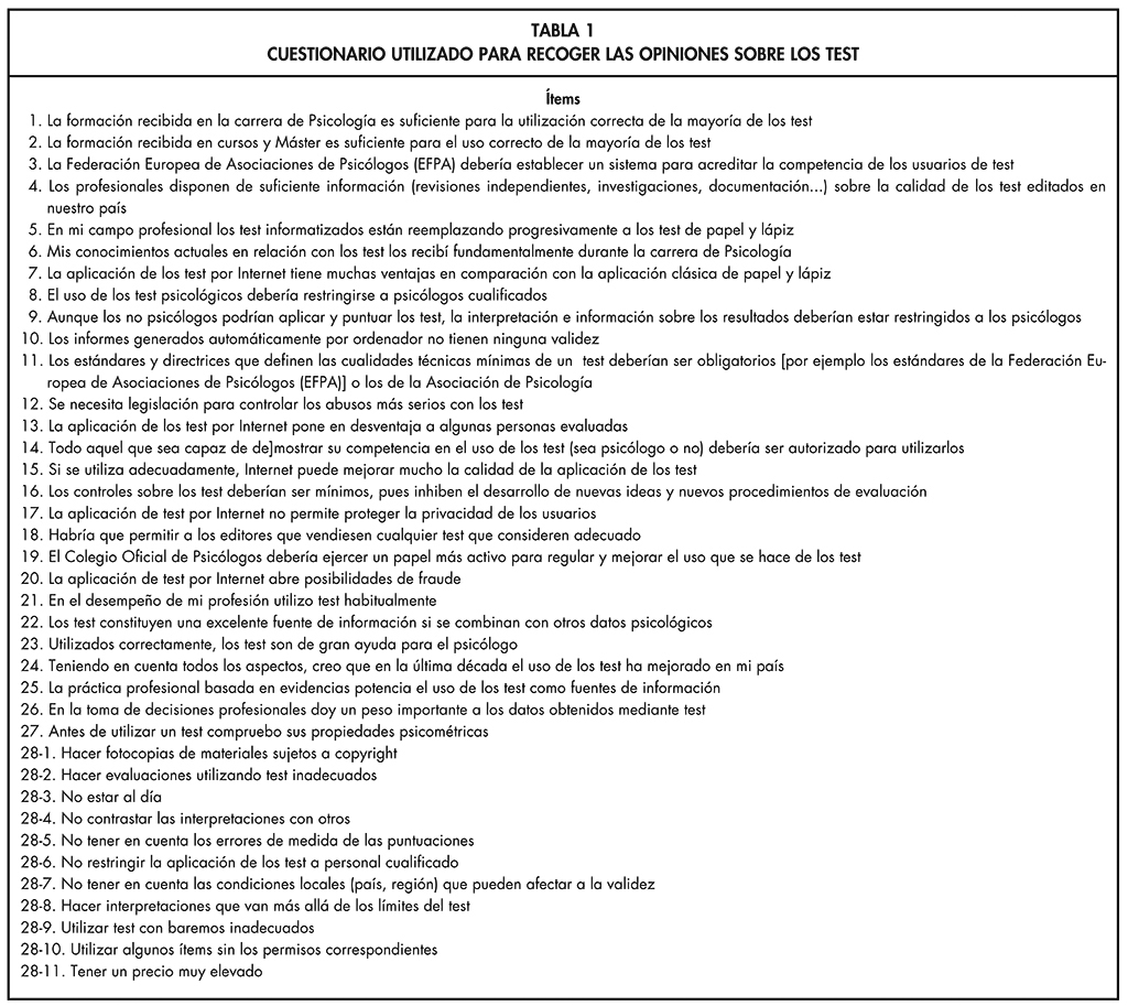El último estudio (Muñiz et al., 2020), ofrece resultados interesantes, tanto en general como diferenciando por especialidad. En primer lugar, los psicólogos españoles (especialmente los del área de Psicología Educativa, seguidos de los del área de Psicología del Trabajo) muestran una actitud positiva hacia los test. Sin embargo, reconocen la necesidad de seguir formándose (e informándose) para usar los test adecuadamente. Asimismo, aunque en general están a favor de incrementar el control y la regulación de los test y su uso, hay diferencias por especialidad en algunas cuestiones, como la necesidad de introducir un sistema para acreditar la competencia de los usuarios de test o introducir más controles, siendo la especialidad clínica la más reacia a estas cuestiones. Por otra parte, los profesionales se muestran moderadamente escépticos a la incorporación de las nuevas tecnologías en la práctica de los test, sobre todo los clínicos. También reconocen que hay problemas en el uso de los test, si bien estos se dan con una frecuencia moderada. El problema más importante se refiere al precio de los test, que se considera demasiado elevado, sobre todo entre los especialistas de clínica-salud y educativa. Finalmente, aunque la evaluación de la calidad de los test que lleva a cabo la Comisión de Test del CGCOP es poco conocida (un 22,5% de los profesionales dicen conocerla), quienes la conocen la valoran muy positivamente.
