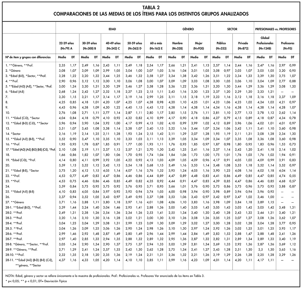 Se obtuvieron los estadísticos descriptivos (medias y desviaciones típicas) de todos los ítems. Para comparar las puntuaciones se realizaron pruebas t de Student, para el caso del género, del tipo de muestra (profesionales vs. profesores) y del sector, para el que se diferenció entre sector privado y público, excluyéndose a las personas en paro. En el caso de la edad, se formaron 5 grupos de edad (ver Tabla 2) y se realizaron ANOVAS. En caso de que estos ofrecieran resultados estadísticamente significativos, se realizaron comparaciones entre los grupos mediante la prueba de Tukey. Cuando no se cumplía el supuesto de homogeneidad de varianzas requerido en el ANOVA, se empleó la prueba robusta de Brown-Forsythe. Cuando los resultados fueron estadísticamente significativos, se empleó la prueba de Games-Howell para realizar comparaciones a posteriori. Todos los análisis se llevaron a cabo mediante el programa IBM-SPSS-26. Además, se obtuvieron indicadores del tamaño del efecto: h2parcial para los ANOVA y d de Cohen para las pruebas t (Cohen, 1992).