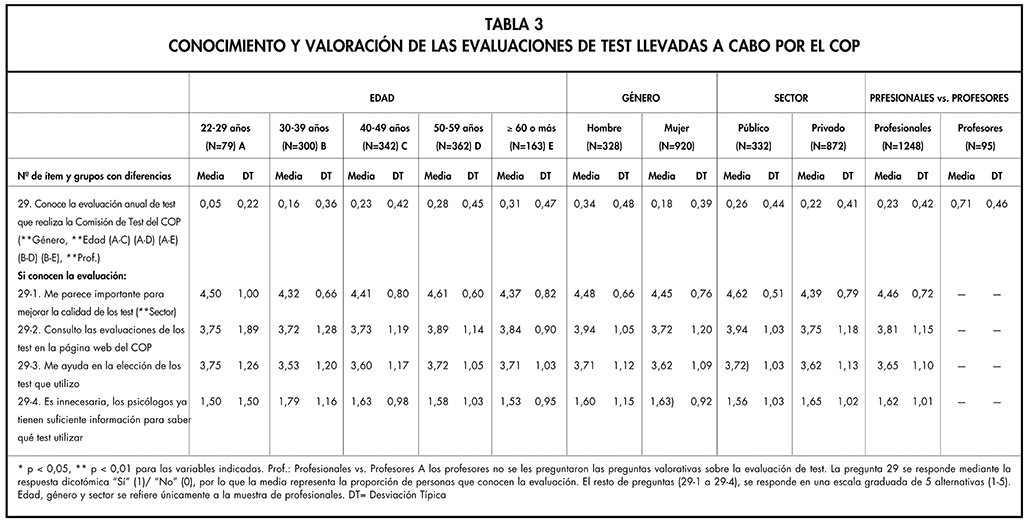 Por lo que se refiere al conocimiento de las evaluaciones de test llevadas a cabo por el CGCOP, conforme aumenta la edad de los grupos, más aumenta el porcentaje de profesionales que dice conocer las evaluaciones (p < 0,001; h2parcial = 0,028), con proporciones que varían entre el 0,05 para el grupo entre 22 y 29 años, y el 0,31 para el grupo de 60 años o más) (Tabla 3). Entre quienes las conocen, no hay diferencias estadísticamente significativas en las valoraciones en función de la edad. En cuanto al género, la proporción de hombres que conocen dichas evaluaciones (0,34) difiere de la proporción de mujeres (0,18) (p < 0,001; d = 0,39), si bien, entre quienes conocen las evaluaciones no hay diferencias estadísticamente significativas a la hora de valorarlas. Por lo que se refiere al sector (público vs. privado), no hay diferencias estadísticamente significativas en el porcentaje de profesionales que conocen las evaluaciones en cada caso. Sin embargo, son los profesionales del sector público quienes consideran en mayor medida que estas evaluaciones son importantes para mejorar la calidad de los test (p = 0,004; d = 0,32). Finalmente, las diferencias entre las proporciones de profesores y profesionales que conocen las evaluaciones son muy marcadas: 0,71 para profesores y 0,23 para profesionales (p < 0,001; d = 1,13).