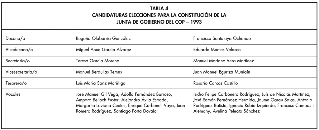 Esta primera etapa se cierra en 1993, Se celebran elecciones en el COP, por primera vez con dos candidaturas (Tabla 4). Se proclama la liderada por Francisco Santolaya. Comienza un proceso de descentralización en la toma de decisiones y transformación de la estructura colegial, así como, con los Estatutos ya aprobados, de consolidación y definición de la profesión, que ayudará al posicionamiento internacional de la psicología.