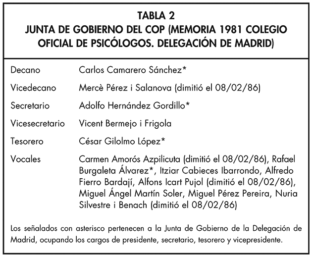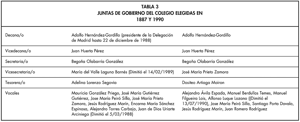 La Junta elegía una Comisión Permanente formada por: Carlos Camarero (Decano), Mercé Pérez (Vicedecana), Adolfo Hernández (Secretario), Vicent Bermejo (Tesorero), y César Gilolmo y Jordi Bajet (vocales). Poco después, el propio Carlos Camarero16 se convirtió en presidente de la Junta de Gobierno Estatal, iniciando un mandato de seis años durante los que no se convocaron elecciones (Tabla 2).