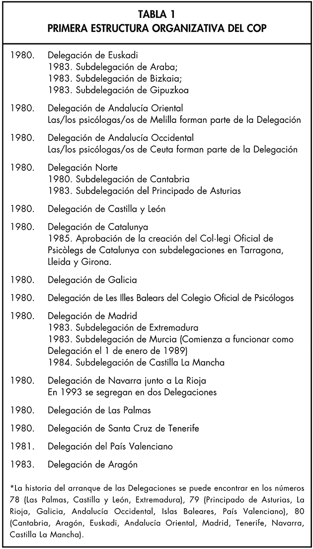 El 8 de enero de 1980 se publica la Ley 43. Su Disposición Adicional Primera establece que la Coordinadora Estatal de Secciones Profesionales de Psicólogos en los Colegios Oficiales y de Doctores y Licenciados en Filosofía y Letras y en Ciencias, debía actuar como Comisión Gestora del Colegio. Elaboró los Estatutos Provisionales (Hernández, 1982b), aprobados mediante una Orden de 24 de marzo de 1980. Reconocían la Gestora como Junta Provisional de Gobierno y establecían las condiciones para la colegiación, los órganos de gobierno, y el primer proceso electoral. Integraban la Junta Provisional representantes de las Secciones que venían funcionando a nivel estatal, de las que Catorce pasaron a ser Delegaciones del Colegio (Junta de Gobierno, 1981a)15 (Tabla 1).