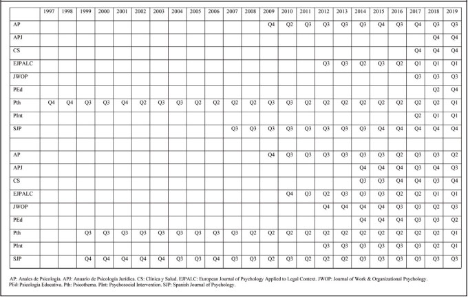 El programa aúna diseminación, posicionamiento e internacionalización. El Consejo y los Colegios continúan su activa política editorial. Arrancan el milenio con 19 revistas, editadas o coeditadas, patrocinadas o copatrocinadas, así como con una serie de monográficos que son de carácter gratuito para los colegiados. El modelo de Agencias de Evaluación instaurado en aquella década, dejaba fuera del sistema, sin rentabilidad para el profesorado universitario, cada vez más habitual en las páginas de las revistas colegiales, alrededor del 90% de las revistas (Ruíz, Martín & Delgado, 2015). Para afrontar la creciente demanda de espacio cualificado, y ante la ausencia de revistas con Factor de Impacto internacional, Universidades y Sociedades Científicas también mantuvieron o iniciaron revistas, pero la falta de profesionalización y la endémica carencia de recursos no permitió que muchas de ellas entraran en la Web of Science (Tortosa, Osca, Alfaro, & López, 2019), algo que comenzaría a cambiar con la destacable ayuda de la organización colegial (Tortosa, et al., 2019) (Tabla 2)20.