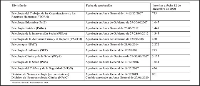 Acabando la década arrancan las Divisiones22, muchas con revistas como órganos de expresión. Las Divisiones más numerosas a día de hoy, son las relacionadas con la psicología clínica y de la salud, prácticamente explican el 60% de las personas inscritas (Tabla 3). En poco más de 10 años se ha pasado de 2 a 11, y de menos de 2.000 a más de 13.000 miembros. No obstante, solo poco más del 17% de las personas colegiadas forman parte de ellas, lo que indica que es necesaria una importante labor didáctica por parte del Consejo y los Colegios para incrementar esa afiliación.