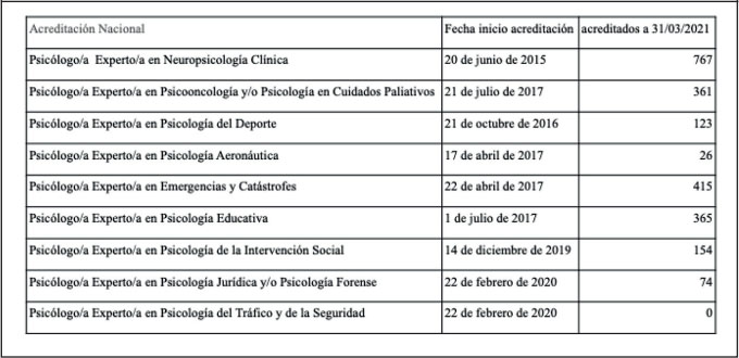 Primero hubo una eclosión de oferta de títulos propios (masters, diplomas de especialización profesional, cursos de experto) por parte de las universidades, que se reorientó con la creación del Master PGS. Pronto, la publicación del RD 639/2015, por el que se regulan los Diplomas de Acreditación y los Diplomas de Acreditación Avanzada orientados a la formación y el desarrollo de la competencia técnica de los profesionales sanitarios abrió algunas posibilidades32. También hubo respuesta desde el COP, el Consejo instauró un proceso de nacional de acreditación no oficial sobre áreas funcionales específicas de la psicología, que ya había tenido algún antecedente en el Colegio de Cataluña y de Madrid. La creación de las primeras Divisiones había generado iniciativas de Acreditación Profesional, al contemplar sus Reglamentos internos las figuras de miembros acreditados. La creación de la Comisión Nacional de Acreditación Profesional afrontó el tema33, y han venido apareciendo acreditaciones, eso sí, sin la validez administrativa necesaria para especializar (Tabla 4). Dominante siempre, por su peso profesional, la oferta en el ámbito sanitario, pero muy diversificada. El objetivo común era garantizar unos estándares de calidad mínimos, e impulsar, con los cursos del FOCAD, los procesos de formación continuada y especializada. El reconocimiento del Colegio supone un aval de competencia profesional por la institución no académica de mayor prestigio, que puede favorecer un mayor reconocimiento social (Jarne et al., 2012).