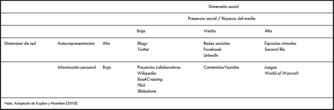 Analizando el tipo y calidad de la información compartida en redes sociales, estas podrían clasificarse combinando modelos teóricos del campo de las redes con modelos sobre procesos sociales (Kaplan y Haenlein, 2010); un eje vendría definido por el nivel de presencia social y la riqueza del medio, es decir, por la cantidad de información que puede transmitirse en un intervalo de tiempo, y el segundo lo marcarían la auto-representación o deseo de control sobre las impresiones que se causan en el otro, y la revelación consciente o inconsciente de información personal (self-disclousure). (Tabla 2).