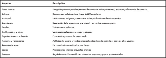 En la Tabla 1 se observa la organización del perfil de LinkedIn en sus 8 aspectos diferentes.