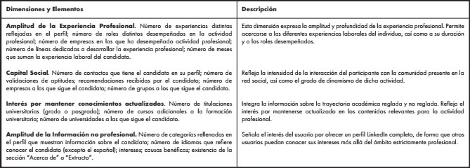 1) amplitud de la experiencia profesional; 2) capital social; 3) interés por mantener la formación actualizada; y 4) amplitud de la información no profesional (ver Tabla 2). Estas dimensiones son generalizables a través de cualquier perfil profesional y han resultado ser eficaces tanto en el análisis de las diferencias entre profesionales TIC en función de su experiencia, como en la predicción de su rendimiento profesional (Aguado et al., 2019).