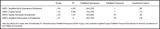 Se utilizaron las cuatro rúbricas descritas anteriormente (ver Apéndice I): amplitud de la experiencia profesional (LKBF1), capital social (LKBF2), interés por mantener la formación actualizada (LKBF3), y amplitud de la información no profesional (LKBF4).