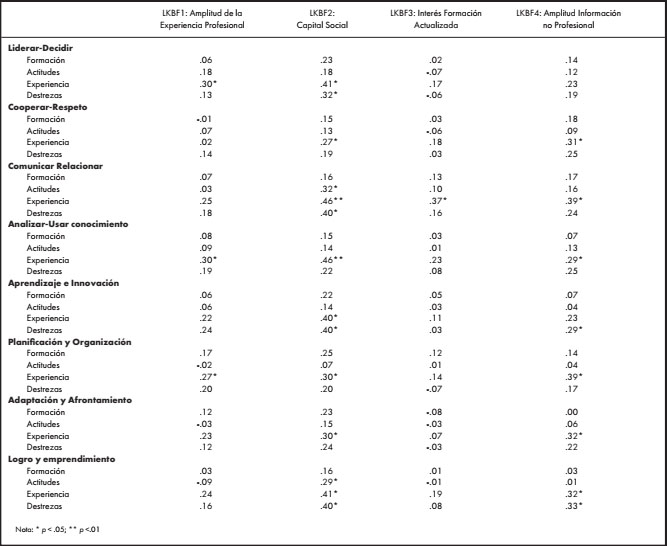 Al observar las correlaciones con las destrezas observamos que las puntuaciones obtenidas en LKBF1 y en LKBF3 no correlacionan significativamente con el comportamiento relacionado con las competencias. Por otro lado, la puntuación en la LKBF2 muestra correlaciones significativas con Liderar-Decidir (r = .32, p < .05), Comunicar Relacionar (r = .40, p < .05), Aprendizaje e Innovación (r = .40, p < .05) y Logro y Emprendimiento (r = .40, p < .05). Finalmente, la puntuación en LKBF4 correlaciona significativamente en el nivel de las destrezas con Aprendizaje e Innovación (r = .29, p < .05) y con Logro y Emprendimiento (r = .33, p < .05).