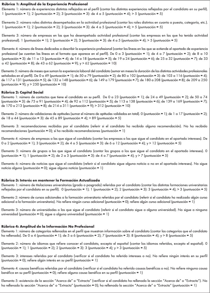 En nuestro trabajo, para la medida de las cuatro dimensiones especificadas en el LKBF se desarrollaron cuatro rúbricas diferentes (una para cada dimensión, ver Apéndice I). En su elaboración se siguieron los estándares al uso (Wenzlaff et al., 1999) y se especificaron tanto los aspectos del perfil LinkedIn a evaluar, como los elementos a utilizar para ello. Para el establecimiento de las diferentes categorías de respuesta, para cada elemento se analizaron las distribuciones de frecuencias encontradas por Aguado et al., (2019) en su estudio original realizado sobre 618 perfiles de LinkedIn en el sector TIC. Como resultado de este ejercicio, los diferentes elementos contemplados en las rúbricas son valorados en escalas de 10 categorías, cinco categorías o dos categorías (presencia-ausencia). Debido a estas diferencias en las escalas de respuesta, siguiendo las recomendaciones de Meade (2010), la puntuación total en cada rúbrica se obtiene mediante la adición de las puntuaciones estandarizadas de cada elemento.