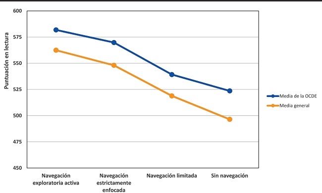 La Figura 1 muestra que el rendimiento en Lectura está fuertemente relacionado con el tipo de navegación de los estudiantes. En la mayoría de los países y economías se encontró un patrón consistente entre las puntuaciones en Lectura y los patrones de navegación. Los datos señalan una diferencia de 66 puntos entre los estudiantes que navegaron activamente entre las páginas y los que no ejecutaron actividades de navegación. El 11% de los estudiantes que pertenecían al grupo de navegación exploratoria activa obtuvieron las puntuaciones más altas en Lectura. Estos estudiantes navegaron activamente a través de tareas de fuente única (ver Apéndice A ítems 1, 2, 3, 4 y 5) y múltiple (ver Apéndice A ítems 6, y 7). Su navegación en tareas con textos de fuente única superó el número de páginas requerido para completar la tarea de lectura. Es decir, no solo leyeron la página requerida, sino también otras páginas accesibles. Este tipo de navegación podría ayudar a los estudiantes a obtener una idea general de toda la prueba de Lectura y prepararse mejor para las siguientes tareas. Esto también podría explicar, al menos en parte, la razón por la que el grupo de estudiantes de exploración activa puntuó mejor en la prueba de lectura que el grupo de estudiantes que siguió estrictamente las instrucciones de la tarea.