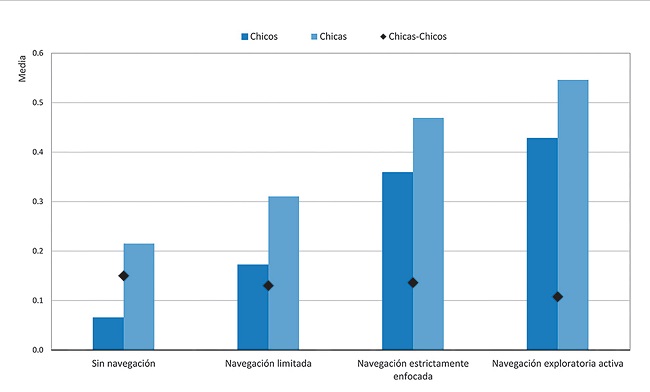 Las chicas presentan mejores estrategias de lectura que los chicos en los tres índices incluidos en PISA 2018 (comprender y recordar un texto, redactar un resumen, y evaluar la credibilidad de las fuentes de información). Este hecho se repite en todos los grupos de navegación. Aun así, tanto los chicos como las chicas que navegaron y exploraron activamente la unidad Rapa Nui tienen un mejor conocimiento de las estrategias de lectura para evaluar la credibilidad de las fuentes que los estudiantes con una navegación limitada o nula. Además, las diferencias de género en las estrategias de lectura son más estrechas entre los estudiantes con una navegación más activa que aquellos sin navegación (Figura 2).