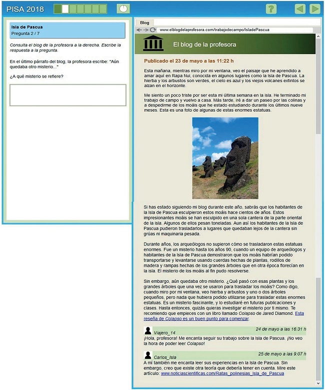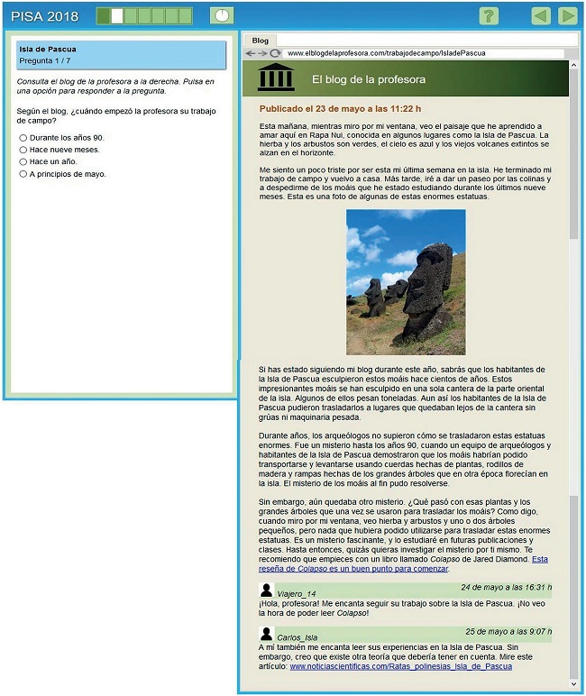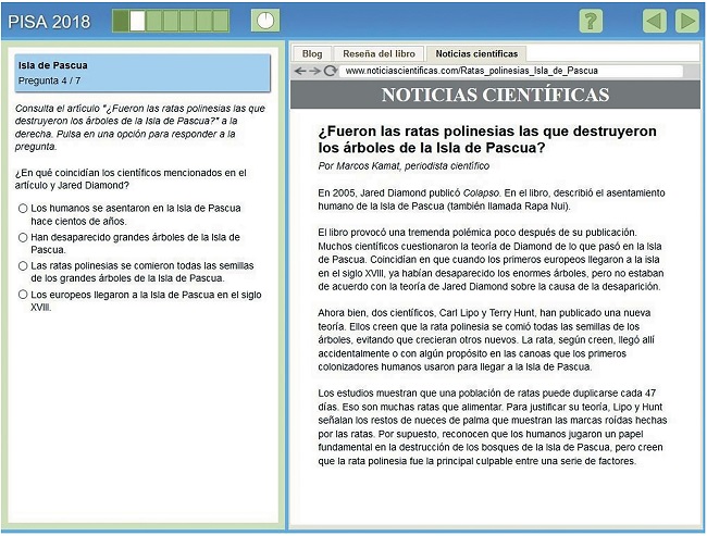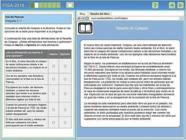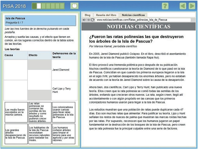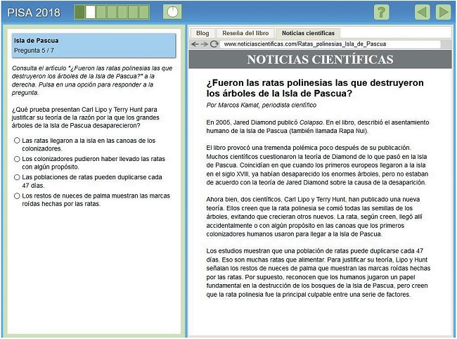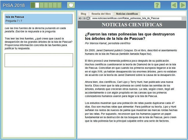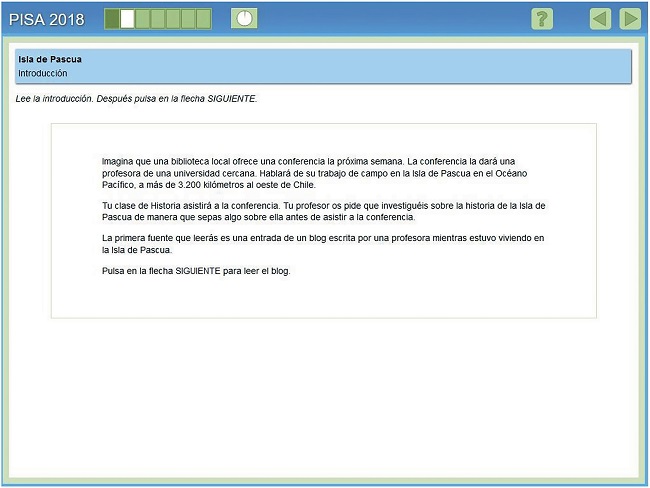 La capacidad de los estudiantes para pensar, monitorear y ajustar su actividad a una tarea en particular son aspectos esenciales a la hora de leer en entornos digitales (OECD, 2019b). Los lectores digitales no solo necesitan seguir estructuras de información lineales, si no también construir sus propios textos seleccionando y evaluando información de diferentes fuentes. Una buena navegación, por tanto, debería ser consistente con estos objetivos. La prueba de Lectura de PISA 2018 permite a los estudiantes navegar a través de las diferentes tareas de tal forma que el estudiante puede decidir cómo interactuar con el texto y qué estrategia es más eficaz. Por ejemplo, un estudiante puede decidir seguir estrictamente las instrucciones de cada tarea según aparecen mientras que otros pueden preferir explorar qué tareas vendrán a continuación para gestionar su tiempo y conocimientos de manera diferente.