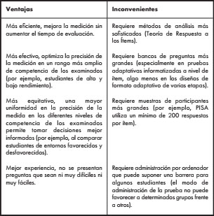 La primera y quizá más extendida es la posibilidad de realizar test adaptativos informatizados (Olea et al., 2010; en este monográfico Abad et al., 2022). Los tests adaptativos informatizados permiten aumentar la precisión en la medición utilizando menos preguntas o ítems por estudiante. Esto se logra presentando a los estudiantes ítems que están alineados con su nivel de competencia. A diferencia de las evaluaciones no adaptativas que habitualmente se centran en evaluar a estudiantes de rendimiento medio, las pruebas adaptativas también permiten una diferenciación más refinada de la capacidad del estudiante en los extremos superior e inferior del nivel de competencia del estudiante (Tabla 1). Este aspecto de las pruebas adaptativas es particularmente relevante cuando se comparan grupos de alto y bajo rendimiento o estudiantes de familias favorecidas y desfavorecidas. Al mismo tiempo, la experiencia de las pruebas para los estudiantes es mejor, ya que no necesitan responder preguntas que sean demasiado difíciles para ellos o demasiado fáciles que hagan que su interés en la prueba se reduzca. El uso de pruebas adaptativas ya se utiliza en la inmensa mayoría de evaluaciones educativas a gran escala como PISA, TIMSS, y PIRLS e incluso en la evaluación de la personalidad (Pedrosa et al., 2016; Postigo et al., 2020; en este monográfico Abad et at., 2022).