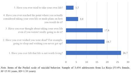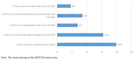 According to the INE (2021), 3,941 people committed suicide in 2020, of whom 300 were young people (14 to 29 years old). In Spain, the lifetime prevalence of suicidal ideation in the adolescent population is around 30%, while the prevalence of suicide attempts is approximately 4% (Fonseca-Pedrero et al., 2018; Fonseca-Pedrero & Pérez de Albéniz, 2020). Figure 1 shows the prevalence of suicidal behavior, measured with the Paykel Suicidal Behavior Scale (Paykel et al., 1974) in a representative sample of the Spanish adolescent population. Figure 2 shows preliminary data on the prevalence of suicidal behavior, assessed with the SENTIA scale (Díez-Gómez et al., 2020), in a sample of 6,050 Spanish adolescents (3,224 females, age range 11-19 years) from the PSICE study (Psychology in Educational Contexts) coordinated by the Spanish Psychological Association and Psicofundación. Similarly, in this same study, when asked about suicidal behavior by means of the Patient Health Questionnaire-9 (PHQ-9), adolescent version, the preliminary results indicate that 9.3% of the sample responded affirmatively to both the item "in the last month, has there been a time when you have seriously thought about ending your life?" and the item "at any time in your life, have you tried to kill yourself or commit suicide?"