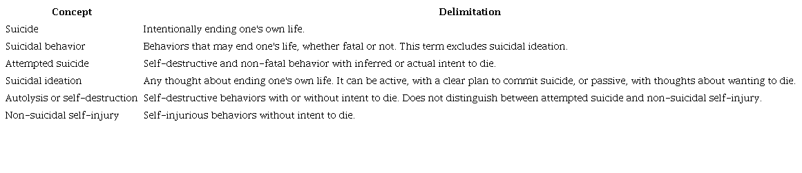 Suicide, etymologically, refers to the act of intentionally causing one's own death. Suicidal behavior is a multifaceted concept that includes different expressions ranging from suicidal ideation (suicidal plan, thoughts of death, death wish, and suicidal ideation), through communication (suicidal threat, and verbal and nonverbal expression) and suicide plan, to the suicidal act (suicide itself, suicide attempt, attempt aborted by others, and self-injury) (Fonseca-Pedrero & Pérez de Albéniz, 2020).