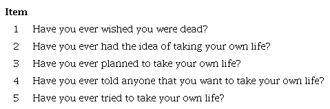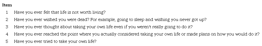 In previous literature, there is a wide range of measurement instruments for the assessment of suicidal behavior in adults and minors (Batterham et al., 2015; Runeson et al., 2017; Saab et al., 2021). The scale with the strongest scientific support (Interian et al., 2018) is the Columbia Suicide Severity Rating Scale (C-SSRS) (Posner et al., 2011) which has been validated in Spanish (Al-Halabí et al., 2016). Different measurement instruments have also been developed and validated in the adolescent population. Here we will only discuss those that have been validated in the Spanish population that have been duly validated in representative samples, namely the Paykel Suicide Scale (PSS) (Paykel et al., 1974) and the suicidal behavior in adolescents scale (SENTIA) (Díez-Gómez et al., 2020) and its brief version (Díez et al., 2021). The items of the PSS and the SENTIA-Brief are presented in Tables 2 and 3, respectively.