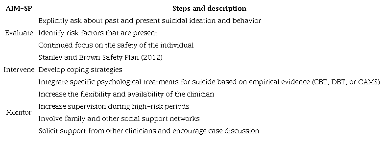 A long list of strategies and programs designed for the prevention of suicidal behavior can be found in previous literature (Reifels et al., 2022). Prevention can be carried out based in the community, educational centers, health centers, etc. In general terms, and knowing that intervention strategies are heterogeneous, different forms of prevention have demonstrated their efficacy and usefulness (Mann et al., 2021; Riblet et al., 2017; Zalsman et al., 2016). However, there are areas such as work environments, universities, and primary care where there is still insufficient evidence. Models for suicide prevention in daily clinical practice can also be found in the literature, such as the AIM-SP (Assess, Intervene, Monitor for Suicide Prevention) model (Brodsky et al., 2018) (see Table 4).