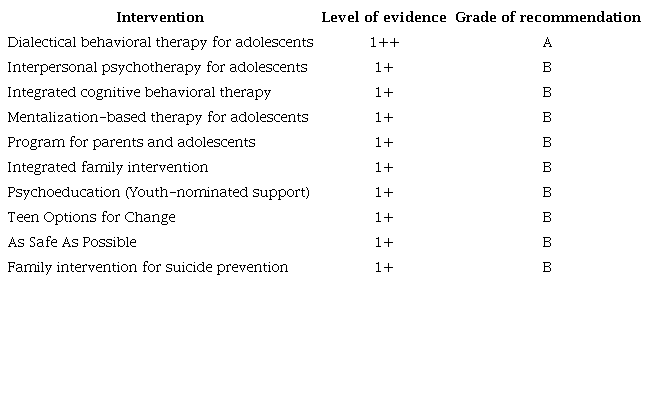 In the field of suicidal behavior in adolescents there are different empirically supported psychological treatments (Al-Halabí et al., 2021a) (see Table 5). According to the levels of evidence and degrees of recommendation of the clinical practice guidelines of the Spanish National Health System (Fonseca-Pedrero et al., 2021), in the approach to suicidal behavior, dialectical-behavioral therapy for adolescents stands out as the only well-established psychological treatment with a grade A recommendation (Kothgassner et al., 2021). With a grade B recommendation are interpersonal psychotherapy for adolescents, integrated CBT, mentalization-based therapy for adolescents, the Resourceful Adolescent Parent Program (RAP-P), integrated family intervention (Safe Alternatives for Teens & Youths), psychoeducation (Youth-Nominated Support Team), brief interventions (e.g., Teen Options for Change; As Safe As Possible), and Family Intervention for Suicide Prevention.