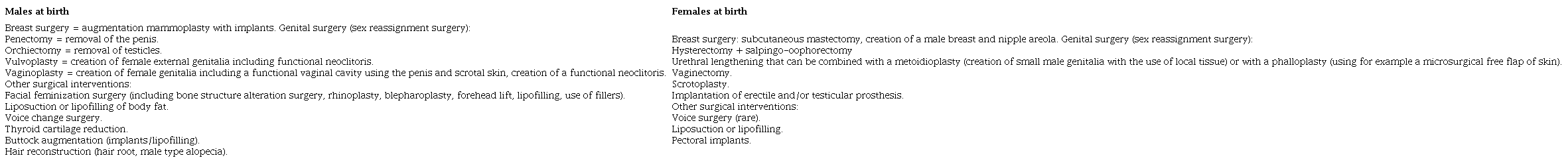 The transition can have four phases. Briefly, these would be as follows: social transition of changing name, pronouns, and appearance, puberty blocking (around 11-12 years, depending on development) with gonadatropin-releasing hormone analogs that suppress the production of sex hormones (testosterone or estrogen), cross-hormonal treatment (around 16 years) based on testosterone for girls and estrogen for boys, and gender affirming surgery (from 18 years of age, but if done earlier it would not be the first time). Gender affirming surgery may include mastectomy, vaginectomy, and phalloplasty for female-to-male (transgender male) change, and vaginoplasty consisting of penile reconversion into a vaginal cavity for male-to-female (transgender female) change, in addition to other complementary plastic surgeries (Claahsen-van der Grinten et al, 2021). Table 1 presents the surgical procedures for natal males and females.