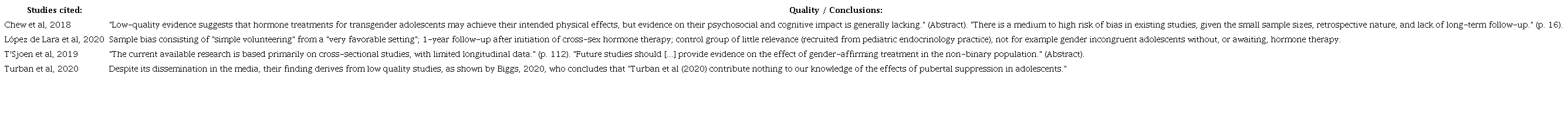 Nor is the haste with which a pediatric clinical guideline recommends affirmative therapies justified on the assumption that, if "they are delayed excessively or there is no affirmative social intervention to support these minors, there could be an overall increase in psychopathology and other undesirable situations" (Moral-Martos et al, 2022, p. 3). As the guideline itself acknowledges: "Although experience in the management of hormonal and surgical treatments is increasingly extensive, the scientific evidence is weak and relatively scarce due to the lack of methodologically adequate studies that assess long-term results, especially for treatments initiated in the peripubertal stage; however-as the guideline continues-there is evidence that demonstrates the benefits of both pubertal blocking and gender affirmation treatment on the health of trans people" (Moral-Martos et al, 2022, p. 3). In this regard, the guideline cites as evidence four studies (Chew et al, 2018; López de Lara et al, 2020; T'Sjoen et al, 2019; Turban et al, 2020), which themselves are, curiously, examples of studies that are methodologically inadequate to assess long-term outcomes, due to their acknowledged or readily demonstrable low quality and certainly no long-term follow-up. Table 2 shows what these studies contribute.