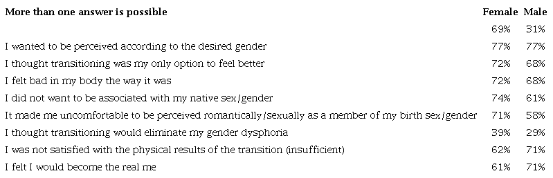 A study conducted online, with the purpose of describing a population of people who experienced gender dysphoria, chose to undergo a drug-surgical transition, and then dropped out, recruited one hundred participants, 69 natal females and 31 natal males (Littman, 2021). The study was interested, among other things, in the reasons for both transition and detransition. Table 3 shows some of the reasons for transition and Table 4 for detransition.