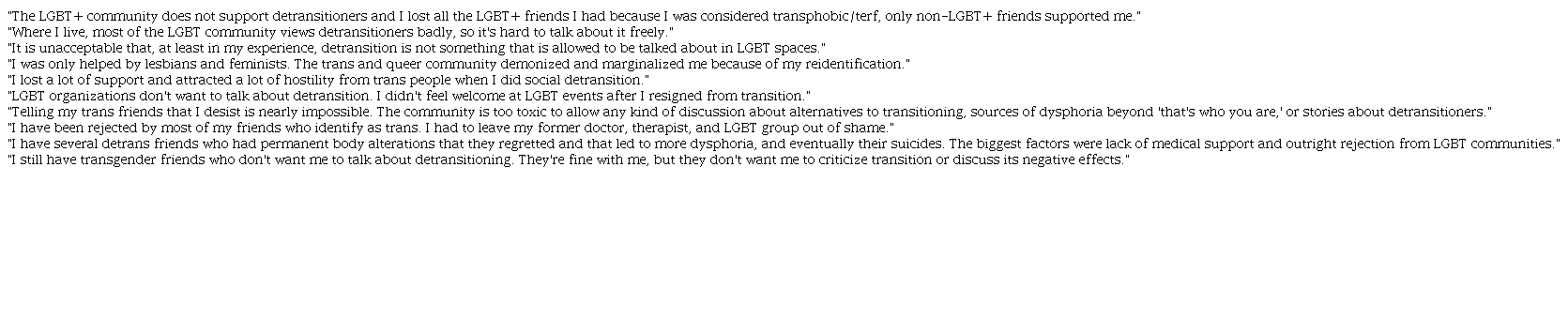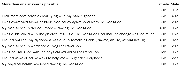 Similarly, the study shows negative medical experiences during detransition ("When I first mentioned to my doctor that I wanted to get off testosterone, they were very dismissive and condescending about it;" "As soon as I 'detransitioned' I was discharged from all gender services, despite asking for help in dealing with sexual dysphoria in case it resurfaced," etc.) as well as difficulties in finding therapists that are friendly to detransitioners (Vandenbussche, 2021, p. 11).
